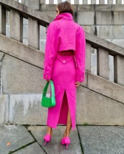 Assim como na Primeira Guerra Mundial, os acontecimentos históricos influenciaram e muito o mundo da moda e nos modelos de roupas da época. Foi exatamente assim na Pandemia da Covid 19 onde vimos nosso mundo, vida e rotina virarem de cabeça para baixo. O mundo foi tomado por uma onda de medo, incertezas e tristeza com tantas mortes. E com isso veio o isolamento social onde passamos a não ir mais ao trabalho e sim montar escritórios dentro de casa (infelizmente muitos não puderam fazer o mesmo). E na realidade do home office vieram as reuniões via internet e com elas as roupas formais ficaram apenas da cintura pra cima, junto com um aumento no foco em joias, maquiagens e cabelo. Por baixo, uma onda de moletons, pantufas e roupas confortáveis tomou o mundo da moda. As lojas de decoração tiveram um aumento significativo na venda de poltronas com foco em conforto. Marcas desenvolveram rapidamente pantufas, e diferentes estilos de roupas com característica de aconchego. Com a moda toda voltada para o bem estar e conforto, cresce o interesse por trabalhos manuais e a valorização de produtores locais. No caso das cores, ficaram mais calmas, sobreas e com isso chegou também à monocromia. Hoje, depois de dois anos de distanciamento social vemos o mundo caminhando para o fim da Pandemia. Com isso a moda vem tendo outra reviravolta histórica que vai estar nos livros do futuro. A vontade de viver, sair e celebrar é unânime entre todas as nacionalidades e com isso não é de se estranhar que surjam tendencia e estilos de roupas de moda alegres e vibrantes. Por isso temos a Moda Dopamina, que nada mais é do que roupa que traz alegria. A tendencia já vem sendo vista, mas ganhou força mesmo agora no Verão de 2022. Com ela vemos também a volta do querido color block, que é a tendencia de montar blocos de cores com as roupas, na maior parte das vezes cores vibrantes. Parece até que foram feitos um para o outro. Vamos ver alguns looks para entrar nesse mood? O truque aqui é simples: Usar cores primarias ou vibrantes, e para as mais ousadas montar um look monocromático, todo da mesma cor!